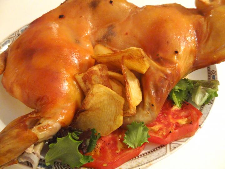 En la bandeja del horno ponemos un poco de agua el vaso de vino, la hoja de laurel y encima la parrilla. Salpimentamos el cochinillo por dentro y por fuera. Ponemos encima de la parrilla y lo metemos en el horno durante una hora a 170º. Mientras en un cazo ponemos la manteca y a fuego muy lento la hacemos liquida. Pasada la primera hora sacamos el cochinillo y con una brocha untamos por todas las superficies y volvemos a meter en el horno. Volvemos a repetir la misma operación a 180º varias veces, hasta que quede del tono de tostado que sea de nuestro agrado. Con lo que queda en la bandeja podemos hacer una reducción que nos sirva de salsa.