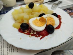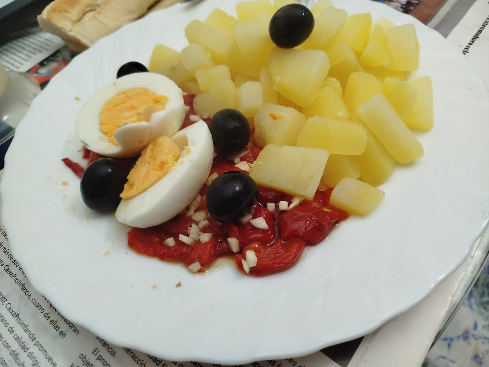 Cocemos los huevos, las patatas y asamos los pimientos que, cuando estén templados los pelamos y cortamos en tiras. Las patatas en trozos según las imágenes.
